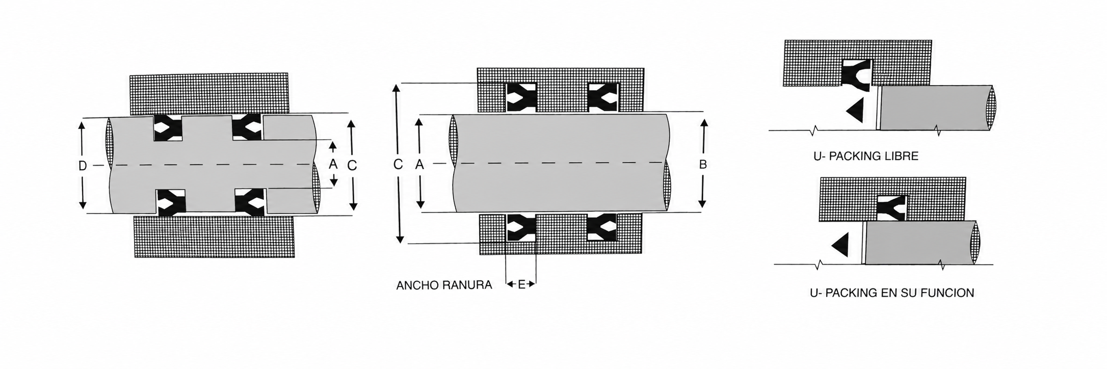 El huelgo máximo se encuentra en la parte posterior del sello para reducir la fricción. A consecuencia de la presión del fluido contra la superficie interior de los bordes aumenta la acción efectiva del sellado. La colocación del sello se realiza por estiramiento y se aloja contra la canaleta interior en forma similar a un O’Ring.